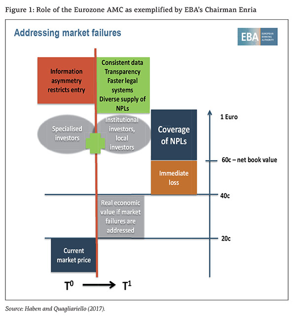 On 30 January 2017, Andrea Enria, EBA’s chairman, called on Brussels policymakers to create a European AMC (we will call it Eurozone AMC, EZ-AMC) to buy billions of euros of toxic loans from lenders in order to break the vicious circle of falling profits, squeezed lending and weak economic growth (see also Haben and Quagliariello, 2017).13)See also the arguments put forth by Beck (2017). Enria noticed that the scale of the region’s bad debt problem has become urgent and actionable as lenders now hold more than €1tn of toxic loans. He proposes that the EU should create a taxpayer-backed fund to buy bad loans from struggling lenders at their ‘real economic value’ – a level to be determined by the fund after doing due diligence on the loans. This would have the double benefit of increasing transparency around the true value of the vast piles of NPLs clogging up the balance sheets of many banks in the region and increase the size of the nascent market for such assets. The European Central Bank has also suggested that the creation of well-designed AMCs should be carefully considered as part of plans to shore up the Eurozone’s financial stability.