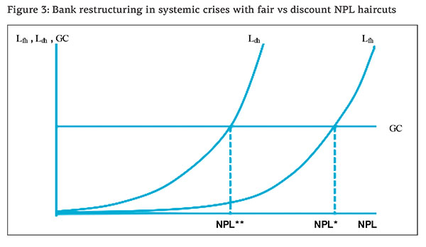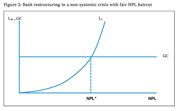 We now adjust De Grauwe’s model, taking it to the case of a single bank’s restructuring in a situation of systemic crisis of the national banking system which the bank belongs to. But, before doing that, let us consider the simpler case in which the decision whether to restructure the banks is taken in a normal situation – i.e., the bank is non-systemic and its national banking system is not in a systemic crisis. We define a Loss curve (Lfh) that is an increasing function of the bank’s NPLs, where NPLs are valued at the ‘fair’ haircut. We also define the Going-Concern line (GC) representing the value of the bank as a going concern – i.e. the bank’s goodwill due to its good reputation, trained workforce, established and successful procedures, tested systems, operational equipment, and necessary licenses and permits – which will be horizontal since it doesn’t change with the bank’s NPL. Figure 2 puts together Lfh and GC. Since Lfh is an increasing function of the bank’s NPL (starting from 0 when NPL=0) while GC stays constant, as we let NPL increase there will be a unique point at which Lfh crosses GC from below. Let’s denote that point as NPL*. For any NPL value below NPL* the losses are lower than GC, implying that the bank should not be restructured, since its value as a going concern is more than the losses it is incurring. When NPL exactly equals NPL* we are in a situation of indifference, since the losses are just equal to GC. For any NPL greater than NPL* the bank should be restructured. Here, there is only one equilibrium.