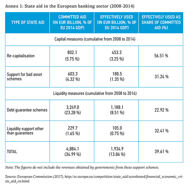 The 2007-2009 Great Financial Crisis (GFC) and the 2010-2012 euro area sovereign debt crisis were very damaging to the EU banking sector and forced EU Member States to undertake bold actions to keep the banking sector afloat. During the period 2008-2014, EU Member States committed in total EUR 4,884.1 billion of state aid1)Approved by the European Commission Directorate General Competition http://ec.europa.eu/competition/state_aid/legislation/temporary.html , which was broadly divided into four categories, namely: recapitalisation (€ 802.9 billion), asset relief measures (€ 603.3 billion), guarantees (€ 3,249 billion) and other liquidity measures (€ 229.7 billion), from which an overall reported amount of (€ 1,934.9 billion) was used (see Appendix 1). Beyond the different forms of state aid used, European banks also received massive emergency liquidity assistance from central banks to keep liquidity flowing in the interbank system.